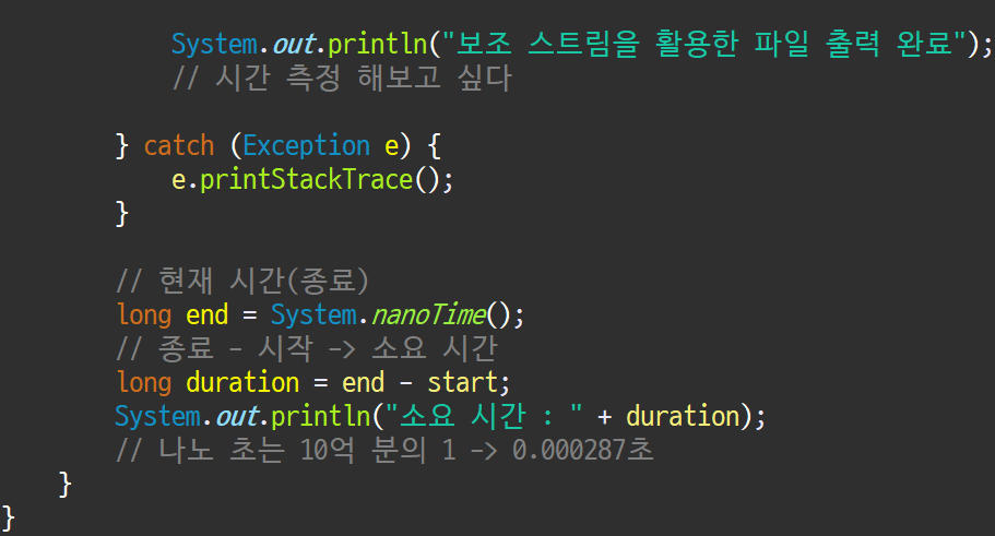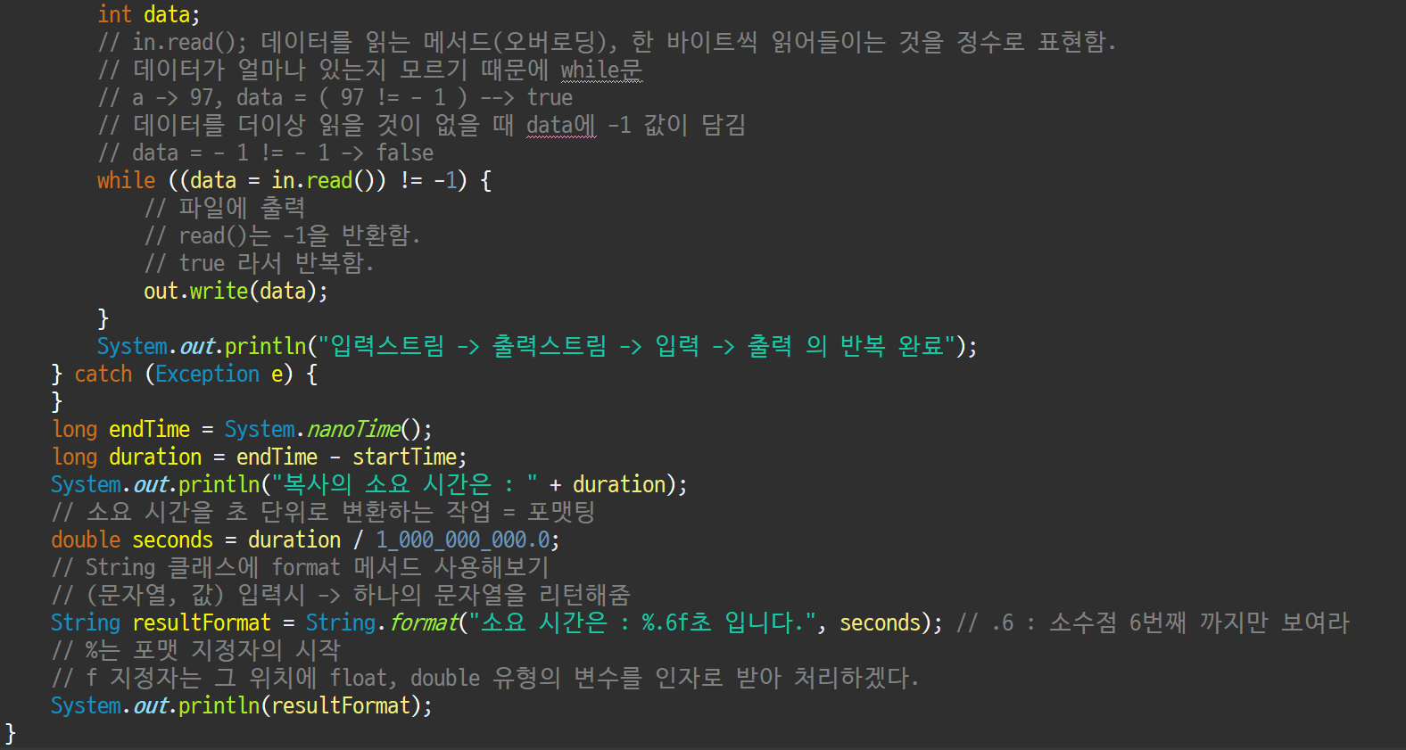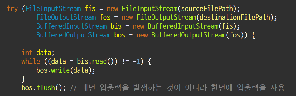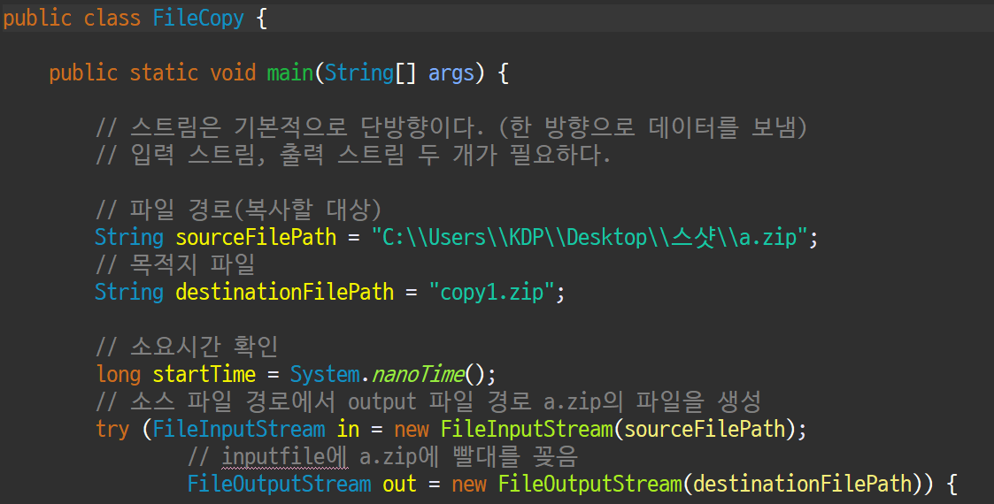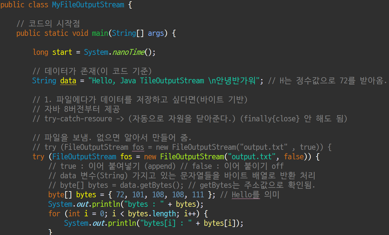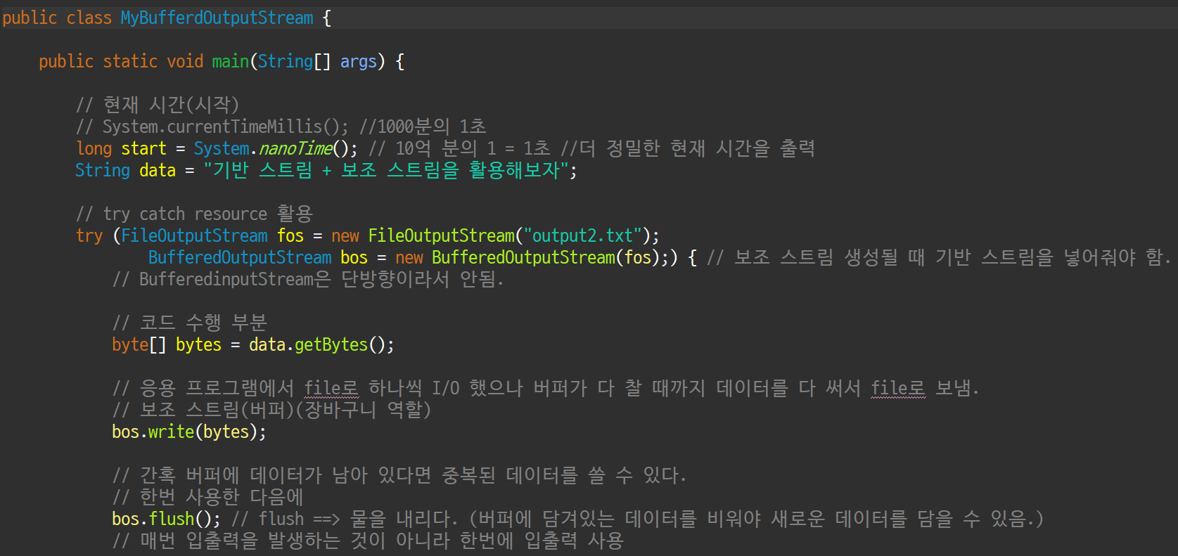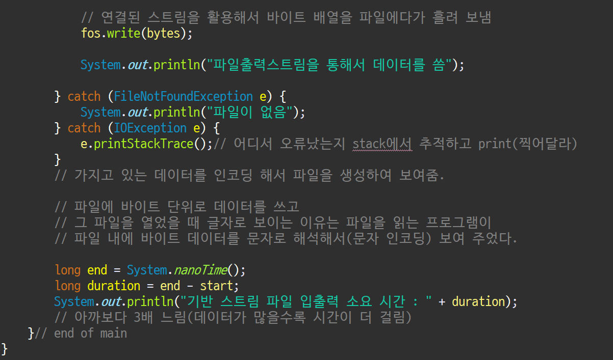 - 파일 입출력을 담당하는 바이트 스트림 : FileInputSream 클래스(파일에서 바이트를 읽음), FileOutputStream 클래스(파일에다가 바이트를 씀)