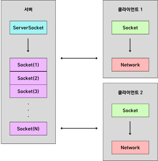 - 서버는 하나의 ServerSocket을 통해 여러 클라이언트의 연결 요청을 기다립니다.