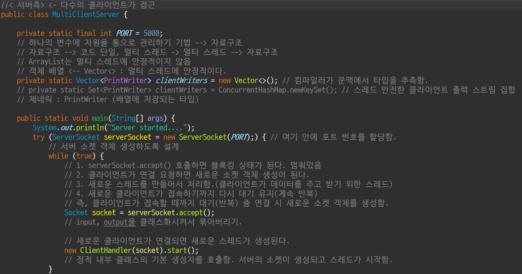 - 서버는 각 클라이언트와의 통신을 별도의 스레드에서 처리합니다. 이를 통해 여러 클라이언트와 동시에 통신할 수 있습니다.