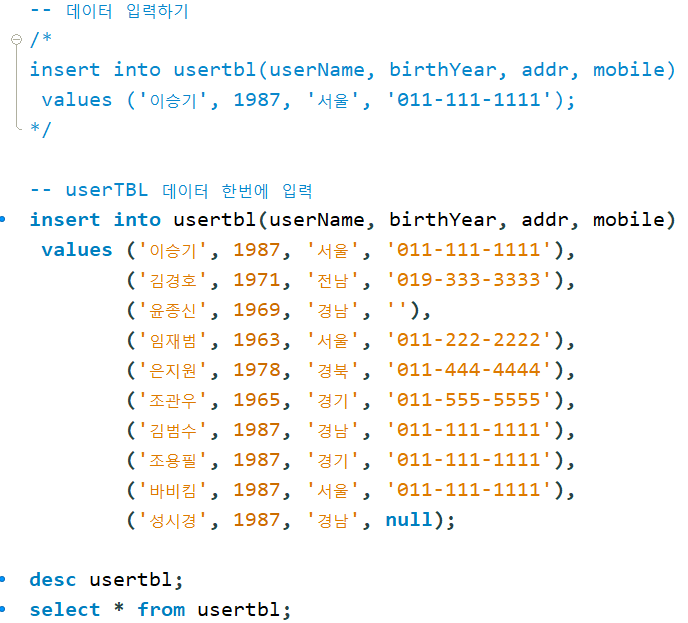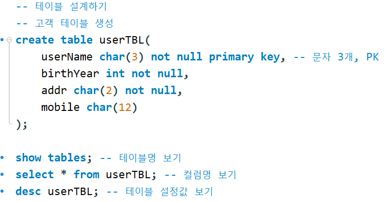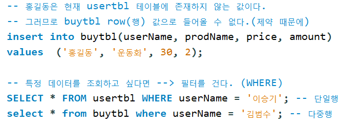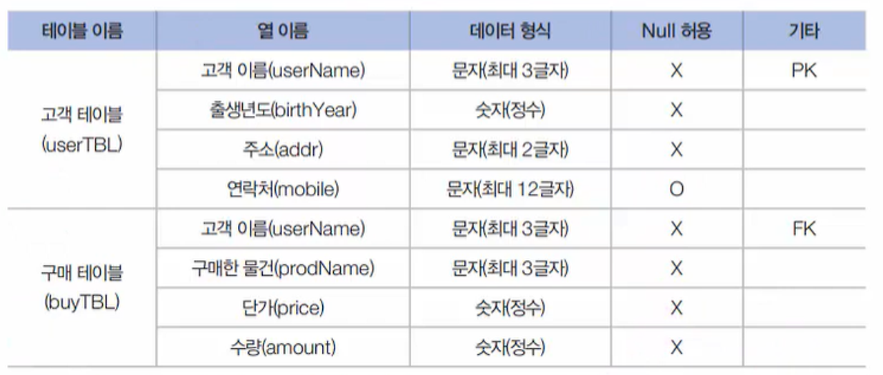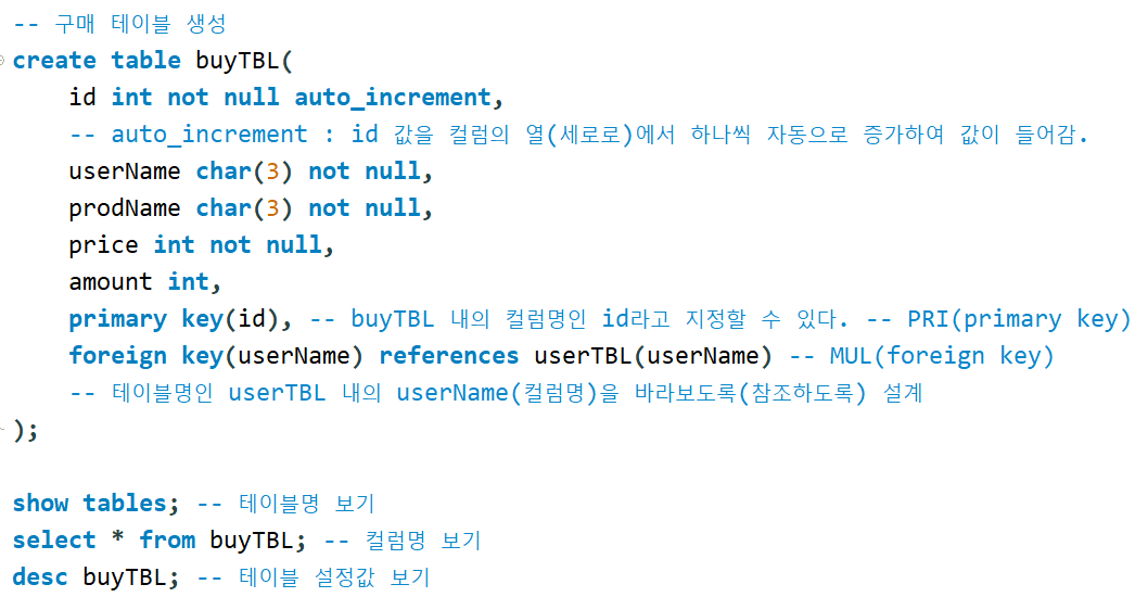 - 예를 들어, 위의 구문은 현재 테이블의 userName 열을 외래 키로 정의하고, 이 외래 키가 userTBL 테이블의 userName 열을 참조하도록 설정합니다. 이는 현재 테이블의 userName 열이 userTBL 테이블의 userName 열에 있는 값 중 하나여야 한다는 의미입니다.