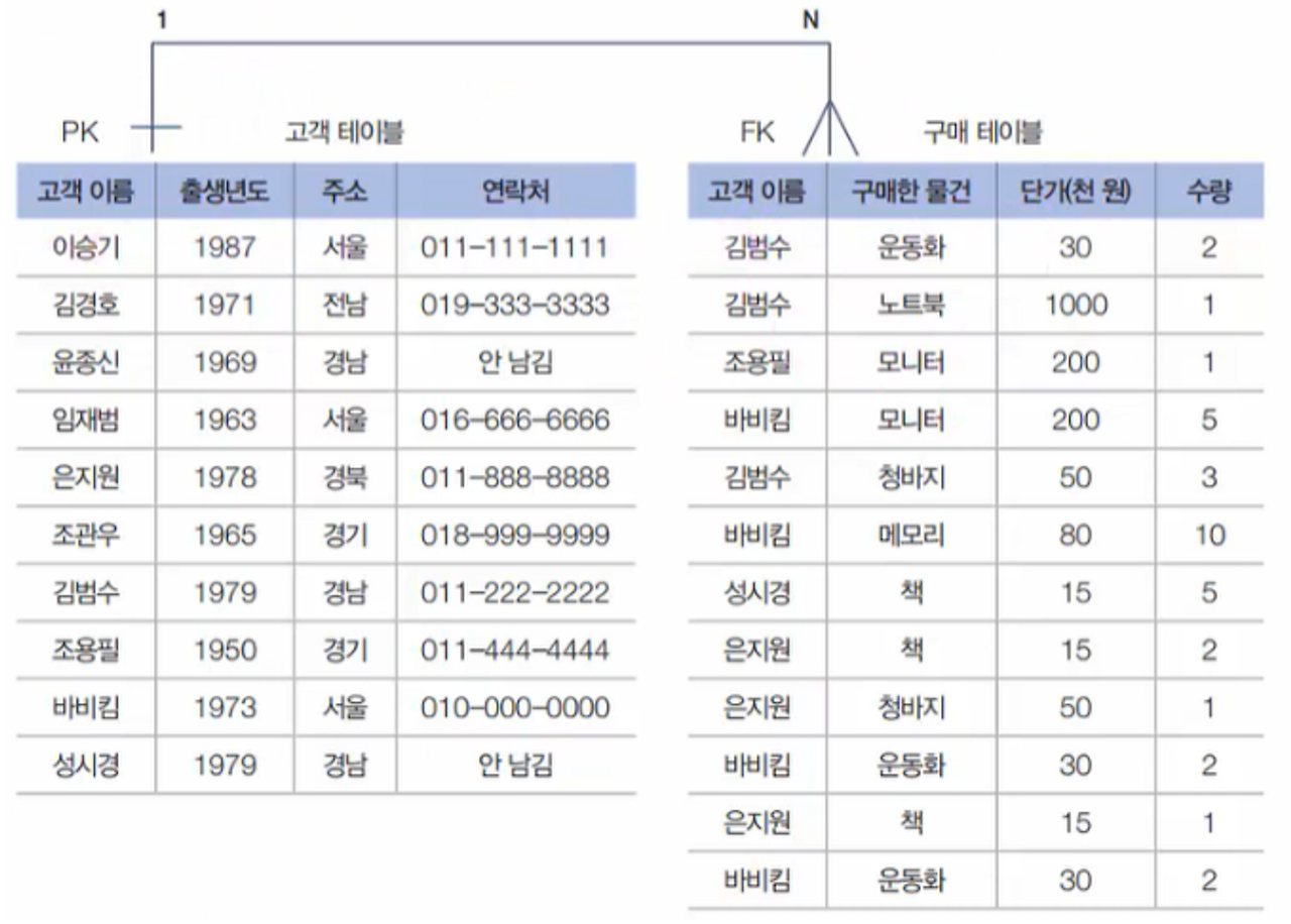 고객 테이블 : 구매 테이블 = 1 : N 관계