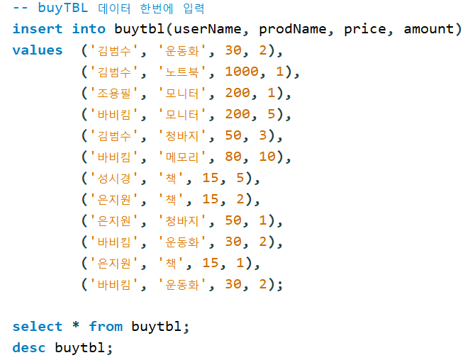 * 구매 테이블 내에 데이터 추가 입력 시도 및 특정 테이터 조회