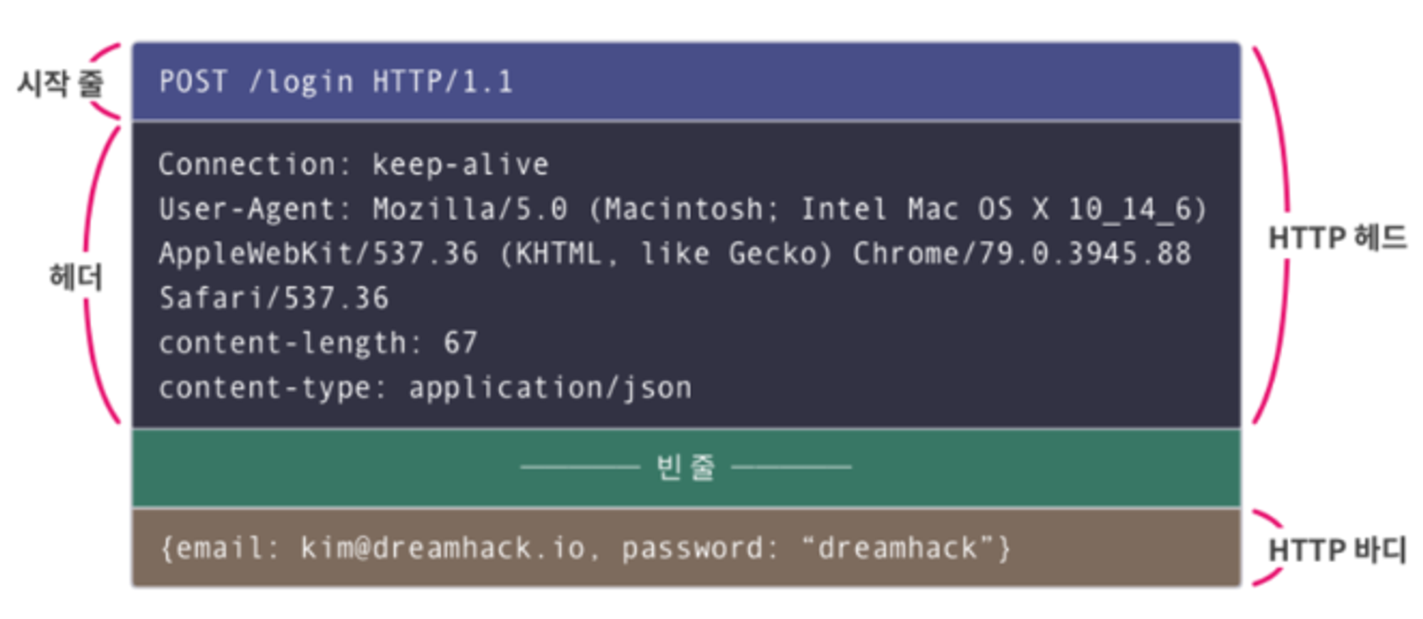 HTTP 헤드의 각 줄은 CRLF로 구분되며, 첫 줄은 시작 줄(Start-line), 나머지 줄은 헤더(Header)라고 부릅니다. 헤드의 끝은 CRLF 한 줄로 나타냅니다.