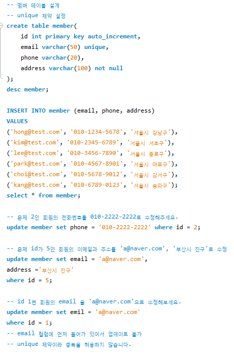 - 테이블 전체에 대해 적용 가능: UNIQUE key는 단일 열 또는 여러 열에 적용할 수 있습니다. 즉, 하나의 열에만 고유성을 적용할 수도 있고, 여러 열의 조합에 고유성을 적용할 수도 있습니다.