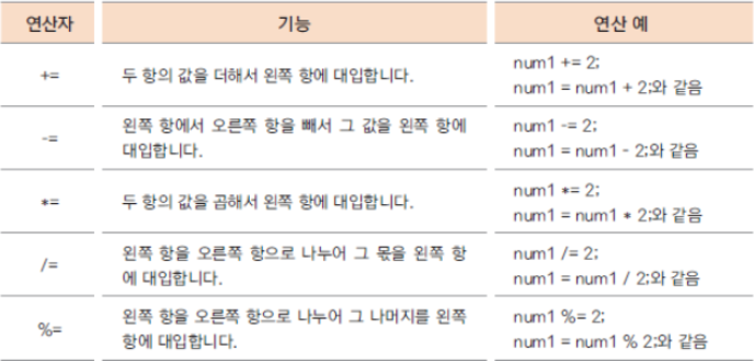- 변수의 실제 값 변경 시 부호 연산자와 함께 대입 연산자를 사용해야 함.