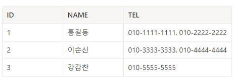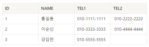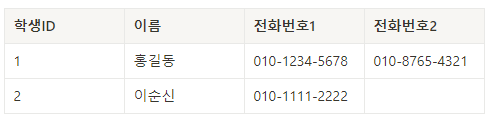 위 표에서 '전화번호1', '전화번호2' 등 전화번호 관련 정보가 반복적으로 나타나므로 반복 그룹이 발생.