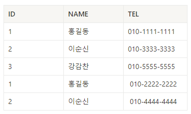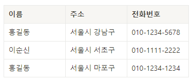 위 표에서 동일한 이름과 주소, 전화번호를 가진 중복 레코드가 존재하므로 이 데이터 세트에는 유일하게 각 행을 식별할 수 있는 기본 키가 없음.