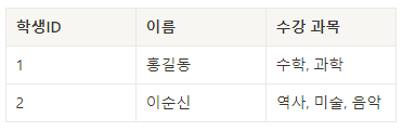 위 표에서 '수강 과목' 필드에 여러 과목이 쉼표로 구분되어 들어가 있어, 이 필드가 원자값이 아님.